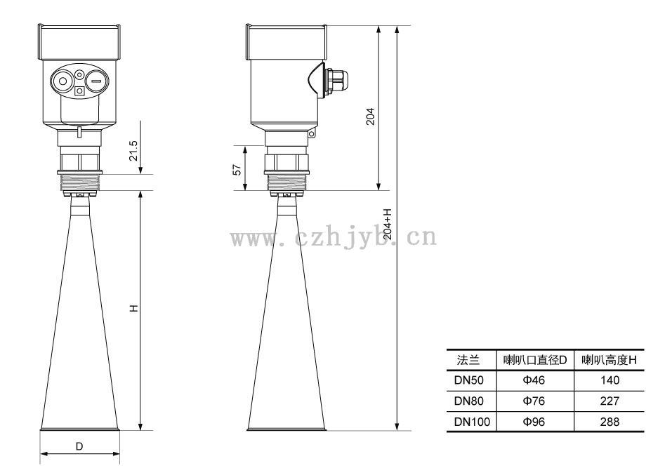 注:使用雷達(dá)物位計(jì)時(shí),務(wù)必保證最高料位不能進(jìn)入測(cè)量盲區(qū)(圖中D所示區(qū)域)。